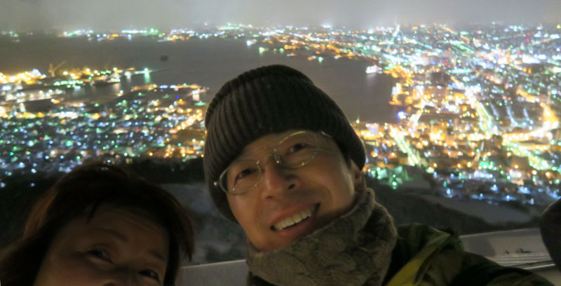 函館についたときは雪がかなり降っていて夜景は望みが薄い状況でした。諦めてとりあえずホテルでスタンバイ。函館は30分でも天候が変わって夜景が見えることがある、と北見のN沼さんの助言があり天候をワッチ。夜になり天気がよくなり函館山が見えるようになりました。直ぐ登ってなんとか夜景を見ることができました。ラッキーでした。When I arrived in Hakodate, we did not expect to see a nice view from the top of Hakodate mountain as the snow was fairly heavy. We gave up and stood by at the hotel for the time being. Mr. Naganuma of Kitami advised us that in Hakodate the weather changes and night view can be seen from time to time. As advised, after a short while the weather got better and Mt. Hakodate became visible. I managed to climb up so that I could see the night view somehow. We were lucky here, too.