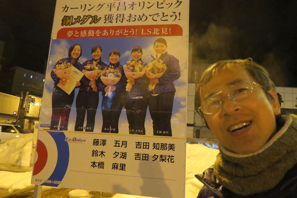 北見はカーリング女子で有名になりました。北見市といっても実際は常呂町なんですけどね。でも駅前にはこのようにチームを応援する看板がありました。Kitami became famous for curling girls. Although curling was originated in Tokoro town, which became a part of Kitami city in 2006, people in Kitami are also proud of them. In fact, in front of the station there was a sign to support the team like this.
