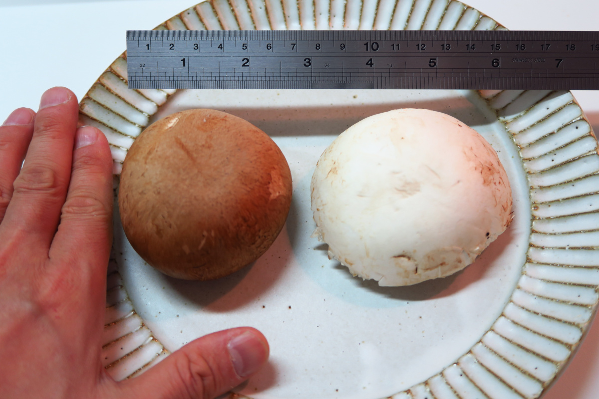 ↓十勝マッシュルームの大きさ紹介。サイズわかるでしょうか。大きなものは直径15cmくらいのものあります。物差しはcmとinchです。